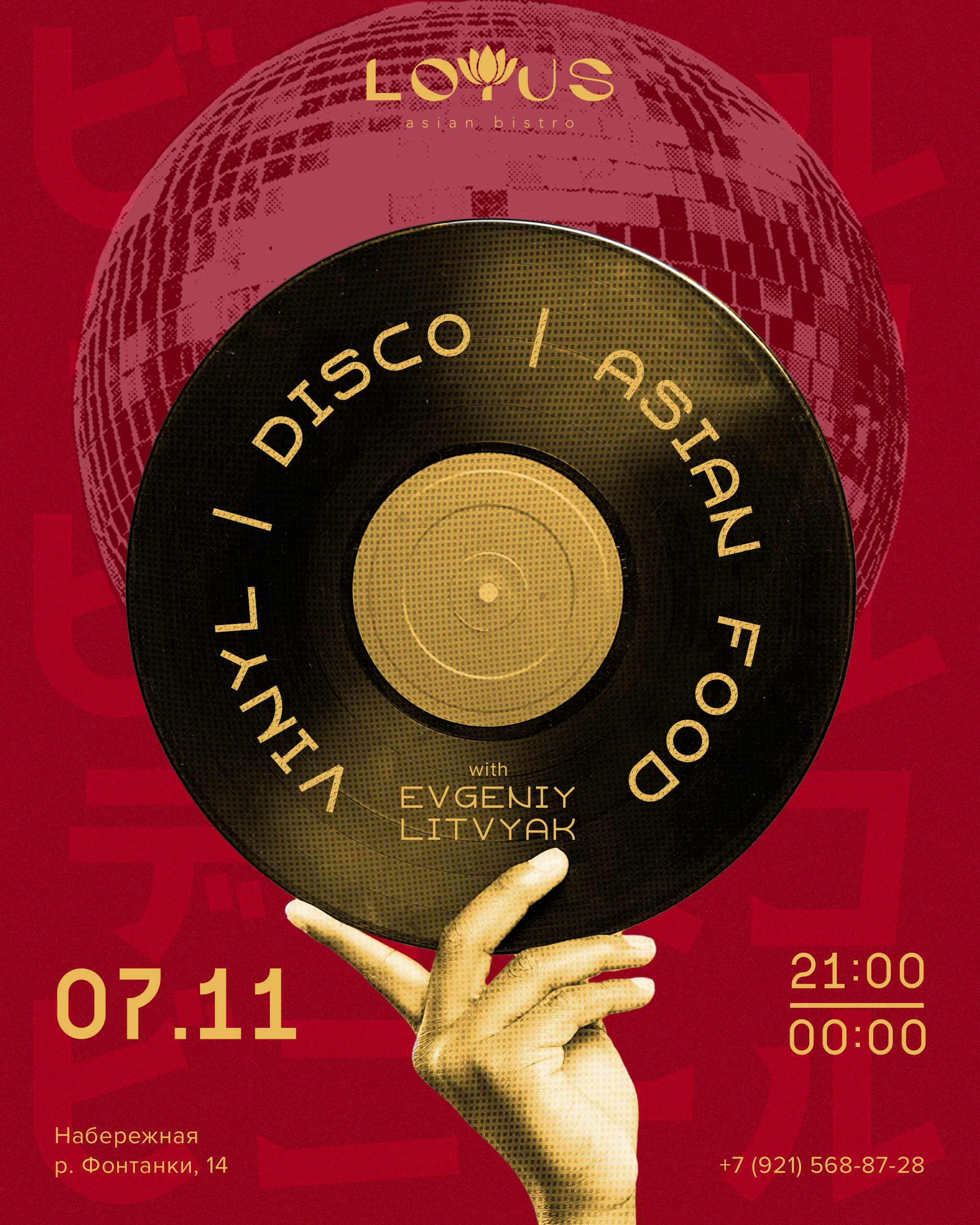 Евгений представит свою подборку в стиле диско на виниле, а команда Lotus Bistro — новое меню с блюдами в духе Азии.
